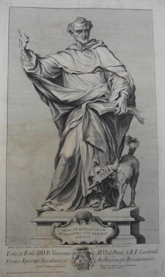 Petrus le Gros Gallus duxit in Ædibus D. Petri in Vaticano ex marmore alt. Palm. Rom. 20 / E[xi]mo et R[everendissi]mo DD. Fr. Vincentio Mæ Ord. Præd. S.R.E. Cardinali / Vesino Episcopo Tusculano et Archiepiscopo Benuentano / Humillme dedicat et Consecrat Obseqmus et Addmus Seruus Fr. Baptista / Pictor eiusdem Ordinis. / Nicolaus Dorigny Gallus del. et Sculp. Romæ Sup. perm. an. 1708.