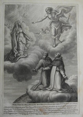 MEDIATRIX NOSTRA, ADVOCATA NOSTRA, TVO FILIO NOS RECONCILIA Bern. Ser.2.aduent[1]. / S. Dominique estant en priere ; vit Jesus-Christ tenant trois jauelots en main qu’il estoit prest de / lancer sur les pecheurs : mais la B. Vierge priant son fils pour eux luy presenta deux de ses / plus fideles seruiteurs St Dominique et St François qui alloient prescher partout la penitence, / & N. S. appaisé par le prieres de sa mere quitta le dessein qu’il auoit pris de perdre le monde / de Cany del. Jean Hainzelman Sculp. S. Anton. 3. p. histor. tit. 73. C. 3[2]