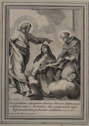 Post familiare colloquium Christus Teresiæ iubet, ut sua / conferat cum S. Dominico : Hic perpetuum ergà / Reformationem pollicetur auxilium / Arnol. Van Westerhout Scul.