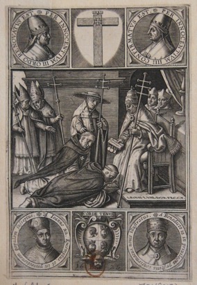 Aux quatre angles de l’image, des papes sont figurés dans des médaillons. Les inscriptions dans les bordures indiquent leurs noms et leurs bienfaits à l’égard de l’Ordre concerné. En haut, au centre, une croix plate surmontée d’un titulo s’inscrit dans une sorte de cœur de lumière. En bas, au centre, des armoiries sont représentées, sans doute celles du dédicataire.