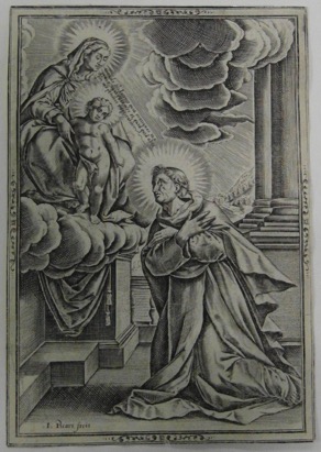 Saint Hyacinthe est agenouillé dans la partie inférieure droite de l’estampe. Présenté de trois quarts vers la gauche, ses bras sont croisés et apposés sur la poitrine pour manifester sa soumission à la Vierge Marie qui lui apparaît dans le coin supérieur gauche. Celle-ci, assise, dans les nuées est en compagnie de l’Enfant Jésus nu et debout devant ses genoux. Il désigne de son index droit le pieux religieux.