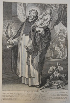 SANCTVS HAYCINTHVS. /Polonus, ex palatinis Odrouansiis sacri Ord. Præd. Jesu amor, et deiparæ corculum, ab ipsa filius appellatus. Vtriusque in Septentrione Apostolus, 54 mortuorum suscitator, mulierum in partus agone, / certus vbique gentium tutelaris, audax super aquas ambulator, nec non ob patrata innumera miracula, verè Taumaturgus. / Den H. HYACINTHVS, glorie der Predick-heeren, ende besonderen mignon vande H. moeder Godts, die haer geweerdicht heeft hem te noemen haeren sone, seggende : verheught v Hyacinthe myn sone, want vwe gebeden syn / mynen sone ende my seer angenaem : houdt voor seker dat ghy verrerygen sult alle t’gene dat ghy door myn voorspracke sult begheeren. Waer door hy geworden is een besonder vertrooster ende patroon der vrouwen in arbeyts noodts / ende verwecker van 54 dooden ende gheneser van alle sieckten. / S. HYACINTHE, Polonois, nay des 54 morts, et marché plusieurs fois a pied sec sur les ondes et s’estre monstré par tout tres fauorable aux femmes en trauaille d’enfant : comme aussi pour autres innumbrables miracles a bon droict est / appelé Thaumaturgus c’est a dire . operateur des grands prodiges. / Cum priuilegio.
