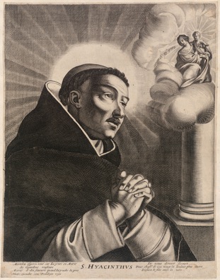 D’après la colonne sise sur la droite, la scène se déroule sans doute dans une église. Saint Hyacinthe est présenté en buste les mains jointes, doigts croisés et repliés, pour indiquer qu’il est en prière. Son regard, avec l’œil gauche curieusement mi-clos semble fixer quelque chose hors image. Le religieux est vêtu de l’habit de son Ordre, chape noire, robe et capuce blancs en dessous. Outre la tonsure, il porte une moustache. Sa tête est amplement auréolée de rayons. En haut, à droite de l’image, la Vierge Marie assise dans les nuées et tenant l’Enfant Jésus, est représentée en très petite taille. La Vierge invite saint Hyacinthe, « son fils », à se réjouir.