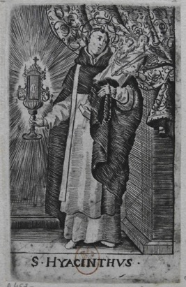 À l’intérieur d’une église, saint Hyacinthe est présenté debout et de face. Il porte contre lui une statue de la Vierge à l’Enfant qu’il regarde, et, de la main droite, une monstrance. Sur la droite, une tenture à fleurs et à arabesques, relevée, donne un peu de profondeur.