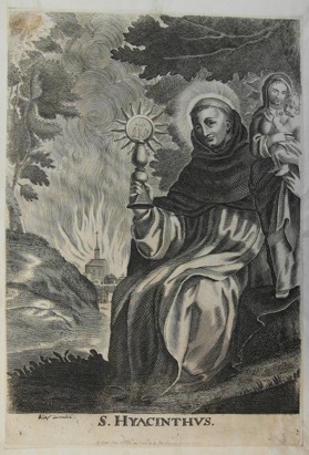 Dans un paysage boisé, saint Hyacinthe est assis sur la droite de l’image. De la main droite, il tient un ostensoir et au creux du bras gauche, il retient une statue de la Vierge à l’Enfant qu’il vient de sauver de l’incendie de l’église. Cet incendie est figuré en arrière-plan, sur la gauche de l’image.