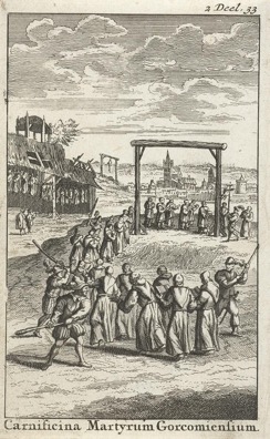 Planche pour Petrus OPMEER (1526-1595), Martelaars-boek, ofte: Historie der Hollandse Martelaren, welke omde Christen Catholijke gods-dienst, soo ten tijden van de woeste heidenen, als der Hervormde nieugesinden seer wreed sijn omgebracht. Begrepen in twee deelen, met twee registers, [2 Deel], Tot Antwerpen, By Petrus Pratanus in’t jubeljaar onses Heeren, 1700, entre les pages 32 et 33.