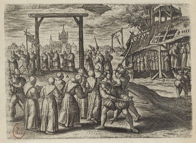 Planche pour Richard VERSTEGAN (vers 1550-1640), Theatre des Cruautez des Herectiques de nostre temps. Traduit du Latin en François, En Anvers, Chez Adrien Hubert, 1588, p. 59.