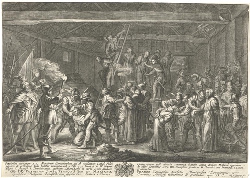 Par un jeu de lignes très serrées, l’image restitue l’atmosphère nocturne qui fut celle du martyre de Briele, à l’intérieur de la grange, cependant ouverte dans le fond sur un paysage et la ville. La scène est foisonnante. Au centre de la composition des religieux sont déjà pendus à la poutre, mains attachées dans le dos, tandis qu’un autre est tiré de force sur une échelle pour subir son ultime supplice. Au premier plan, trois groupes de soldats (un à gauche, un au centre et un à droite) torturent leurs victimes.