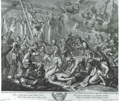 REVERENDISSIMO PATRI, P. FRANCISCO MARIÆ NICHOLIS A CREMONA, TOTIVS ORDINIS SERAPHICI PATRIS NOSTRI FRANCISCI MINISTRO GENERALI VIGILANTISSIMO. / Dira rebellatis dum detonat Hæresis armis, Pro Christo, Christiquè vices Gestante perempti / Obtulit impauidum Sacra Caterua caput, Fulciri his Trabibus Coelica Regna probant. / In Ziernel Inu. et Pinx. Alb. Clowet sculp. Superior. permissu. Obsequentissimus Filius Fr. I. D. B.
