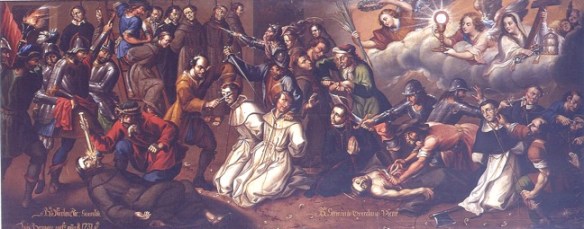 L’image est aussi foisonnante que celles réalisées d’après le dessin d’Abraham Diepenbeeck et situe la totalité de la scène à l’intérieur même de la grange. La pendaison des martyrs aux poutres a été repoussée en arrière-plan et la montée forcée du franciscain sur l’échelle, tiré par son bourreau, est décalée sur la gauche. La partie supérieure droite de l’image a été ainsi libérée pour faire apparaître des nuées deux anges et quatre putti. L’ange au plus près des pendus tend vers eux une palme et une couronne. Le deuxième tient en main un calice surmonté d’une hostie, tandis que la figure féminine allégorique de l’Église tient croix, clefs de saint Pierre et tiare. Par ce deuxième ange et par la figure de l’Église sont ainsi signifiés les motifs du martyre des religieux : leur fidélité au dogme eucharistique et à la fonction papale. Toute la largeur du bas de la moitié inférieure de l’image est occupée par des scènes de torture des martyrs. Sur la droite Jean de Cologne, agenouillé les mains attachées dans le dos, a le cou tenu en corde par un homme qui est en train de lui trancher l’oreille. Devant lui une paire d’oreilles gît déjà au sol montrant que ce supplice a déjà été subi par un autre.