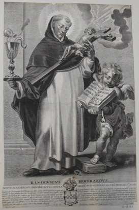 (I)NCLYTO AC GENEROSO DOMINO. D. LVDOVICO SPINOLA SERENmi DVCIS NEOBURGICIAD CVRIA[M] BRVXELLENsem LEGATO / Ludouicum Bertrandum G.D. Nouitiorum nostri ordinis Archimagistrum (vt pote qui id genus muneris septies incorruptus obiit [?]) Valentia Aragonum in lucem dedit : Coa: / ceruauit hic dum grandior foret sui carnisicinam, et cistam resertam loris, flagellis, cal- caribus, clauatis crucibus etc : seu arcam fæderis venerabundus asseruauit : Prudenter / omisero Apostolicum eius sudorem quo India irrigata est: Luentes animas quas cælo- donauit: Vaticinantem spiritum quo plenus fuit, propinatum virus quod cælitus dulcora- / uit.: etc. Illum peruersorum, et huius si afforet, sæculorum defletorem ; qui animam tris- / tem sortitus non nisi sacris imaginibus, et nostrorum confratrum intuitu infantes / lacrijmas reprimebat, vestris insignijs, et generose nomine notamus : vt. I. V. D[omi]nao quæ hoc ferreo tempore plus cælo quam terris militat, habeat quem Sancte æmuletur. / Hunc igitur n[ost]ri ord. Athletam, vel ex hoc solum tibo plusquam debitum quod Neobur- gici splendoris scintillas largius excipis, à quo et nos hic n[ostt]ræ lucis primordia parti- / cipamus, vna cum votis et animis o[mn]ium n[ost]rum fauenter acceptet.
