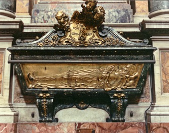 L’image reproduit la châsse du bienheureux Pie V commandée en 1697 par Antonin Cloche pour y recueillir les restes du saint pape. La châsse en bronze doré fut installée en 1698 dans l’église Sainte-Marie-Majeure de Rome. Sur l’abattant frontal ouvrant est sculpté en bas-relief le corps du défunt pontife, la tête placée à droite. La châsse est surmontée d’un cartouche environnée par trois putti, indiquant le nom et titre du religieux.
