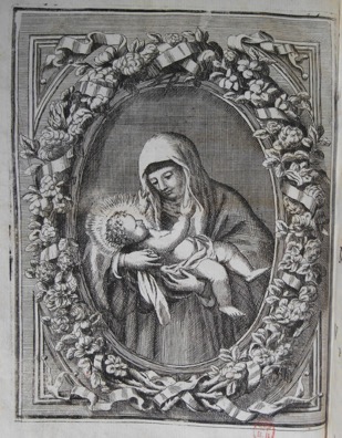 Dans un ovale richement bordé d’une guirlande de fleurs et de rubans, la bienheureuse Rose de Lima est présentée en ¾, légèrement tournée vers la gauche. Elle est vêtue de l’habit de son Ordre et porte sur le front une couronne d’épines métallique qui la fait saigner. La religieuse tient sur un linge dans ses bras l’Enfant Jésus qui tend les mains vers son visage. La tête de l’Enfant est auréolée de rayons. Le fond de l’ovale est en tailles croisées.