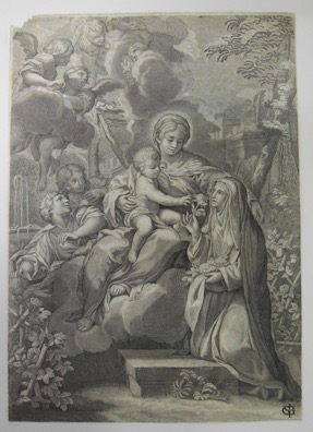 Dans un paysage où se devine au loin une église dans le coin supérieur droit, la Vierge Marie, assise sur une nuée et tenant l’Enfant Jésus debout sur ses genoux, occupe la place centrale. L’Enfant touche une rose que sainte Rose agenouillée dans le coin inférieur droit lui présente. La sainte porte d’autres roses dans le creux de son scapulaire. Sous le voile blanc couvert par le manteau noir, Rose a la tête ceinte d’une couronne métallique. Sur la gauche deux personnes assistent à la scène. Dans le coin supérieur gauche, plusieurs angelots et putti sont témoins de la scène.