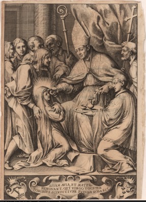 L’estampe reproduit sans doute celle éditée dès 1670 à Rome pour illustrer la Vie du futur bienheureux Turibio, béatifié en 1679 (voir Œuvre en rapport ci-après). Rose de Lima ayant été elle-même béatifiée en 1668, il apparaît clairement que le choix de la scène vise à valoriser l’évêque. Il est celui qui a donné le sacrement de confirmation à la première bienheureuse du Nouveau Monde, validant, lors de ce sacrement, le choix de son surnom, Rose.