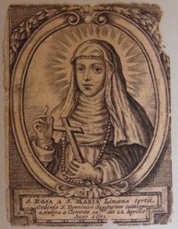 Rose de Lima : dans un ovale surmonté d’une guirlande de fleurs, Rose de Lima est présentée en buste. Sous son voile blanc de tertiaire, elle porte une couronne d’épines métallique. Le rosaire est porté sur la poitrine. Elle tient en main une simple croix plate. La sainte est auréolée de rayons. Sous l’ovale, un cartouche rectangulaire porte la légende.
