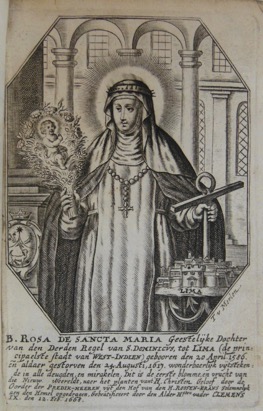 B. ROSA DE SANCTA MARIA Geestelijke Dochter / van den Derden Regel van S. DOMINICVS, tot LIMA (de prin- / cipaelste stadt van WEST-INDIEN) gebooren den 20 April. 1586. / en aldaer gestorven den 24 Augusti, 1617. Wonderbaerlijk vijtsteken- / de in alle deugden, en mirakelen. Dit is de eerste blomme , en vrucht van / die Nieuw weereldt, naer het planten vant H. Christen Geloof door de / Oorder der Predik-Heeren vijt den Hof van den H. ROOSEN-KRANS Solemnelyk / (.)en den Hemel opgedragen, Gebeatificeert door den Alder Hsten vader CLEMENS / IX. den 12. Feb. 1668.