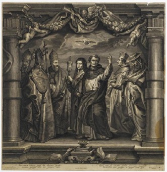 Le décor est très architecturé, presque théâtral, encadrant la scène de colonnes baguées, dans le haut, de guirlandes de fruits et de fleurs et d’un rideau frangé retenu par des angelots. À droite, saint Jérôme coiffé de son chapeau cardinalice est plongé dans sa lecture. À ses côtés, doté d’un bonnet de docteur et identifié comme étant saint Norbert, un clerc regarde droit devant lui. De l’autre côté, sont figurés trois pères de l’Église. Seul le rapprochement avec les modelli de Pieter Paul Rubens permet de suggérer que l’évêque le plus à l’extérieur est saint Augustin, tandis que saint Ambroise de Milan serait l’évêque tournant le dos au spectateur. Derrière eux, se retournant, Grégoire le Grand, identifiable par la tiare pontificale, est tourné vers Claire d’Assise qui porte haut une monstrance. À ses côtés, légèrement décalé, Thomas d’Aquin, vêtu de l’habit de son Ordre, un soleil brillant sur la poitrine, enseigne bras et index droits levés vers le ciel. Sous le bras gauche, il porte un gros volume, rassemblant peut-être certains de ses écrits. Au-dessus de Claire d’Assise et de Thomas d’Aquin plane la colombe du Saint Esprit. Au premier plan, en bord de scène, trois livres et une lampe à huile guident l’interprétation de l’estampe.