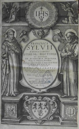 Titre illustré pour François DU BOIS (dit SYLVIUS, 1581-1649), Francisci Sylvii a Brania Comitis, S. Theol. Doctoris, et eivsdem in Academia Dvacena Regij ac Ordinarij Professoris Ibidemque insignis Ecclesiæ S. Amati Can. & Decani. Commentarivs, in tertiam partem S. Tho. Aqvinatis Doctoris Angelici et commvnis: et in eivsdem svpplementvm Centesima quæstione auctum. Editio Secunda Recognita & multis locis aucta, Dvaci. Ex Officina Marci Wyon, Typo. Iurati sub signo Phœnicis, 1622.