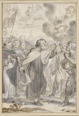 Au centre de l’image, le prophète Élie tente de convertir ses auditeurs. Sa prédication est approuvée par le doigt tendu du Seigneur qui siège dans la nuée. Derrière lui sont groupés des religieux chrétiens de différents Ordres, dont Thomas d’Aquin. Ce groupe est surmonté d’une représentation du Christ ressuscité siégeant dans la nuée.