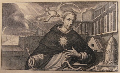 Dans un ovale aux dimensions de la planche, Thomas d’Aquin est présenté assis à une table. Vêtu de l’habit de l’Ordre, il porte sur la poitrine un soleil sur une chaîne d’or. Tenant une plume dans la main droite et un livre fermé dans la gauche, il semble attentif à ce que lui suggère d’écrire sur le livre ouvert la colombe de l’Esprit venant par derrière à son oreille. Les écoinçons sont travaillés en faux marbre.