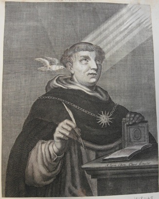 Thomas d’Aquin est présenté en ¾ et de trois quarts vers la droite. Vêtu de l’habit de son Ordre, il porte sur la poitrine le soleil de la sagesse et de la science, et la chaîne de la Catena aurea. La colombe de l’Esprit Saint vient l’inspirer du côté de l’oreille droite. De la main droite, il tient une plume et de la gauche, un livre, posé debout sur une table près du manuscrit et d’un encrier. Un rayon de lumière, provenant de l’angle supérieur droit, symbolise l’approbation divine que reçut Thomas.