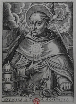 Dans une bibliothèque aux étagères chargées de ses œuvres, Thomas d’Aquin est présenté debout derrière une table. Vêtu de l’habit de son Ordre, il est doté d’une auréole et du soleil de la sagesse de la science. La colombe de l’Esprit Saint vient l’inspirer du côté de l’oreille gauche. Le poing gauche de Thomas écrase un livre qui porte le nom de son auteur, [Martin] Bucer, dominicain passé à la réforme. De ce livre s’échappe un phylactère portant une parole attribuée à Martin Bucer et un serpent. Du côté de la main droite apposée sur la poitrine, un livre est surmonté d’une tiare, celle de Grégoire X. Le phylactère qui dépasse du livre porte les paroles d’approbation du pape.