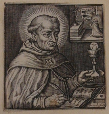 Dans un espace clos mais indéfini, Thomas d’Aquin est présenté assis derrière une table. Vêtu de l’habit de son Ordre, il est doté d’une auréole et une étoile de la sagesse et de la science brille sur sa poitrine [la forme est celle d’une étoile alors que devrait figurer un soleil]. Tenant de la main gauche un ciboire surmonté d’une hostie, il rédige avec la plume de la main droite, ses pensées sur l’eucharistie dont une formule figure sur le livre-cahier ouvert devant lui. Dans le coin supérieur droit, l’image associe une seconde scène de la vie de Thomas : le bene scripsisti de me Thoma. La formule iconographique vise à valider les écrits de Thomas sur cette question déjà ouverte en son temps et mise en cause par les Réformés : le sens de l’eucharistie.