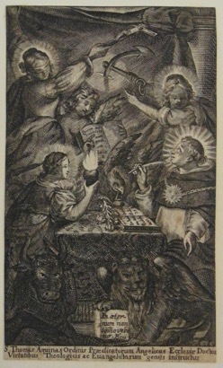 S. Thomas Aquinas Ordinis Praedicatorum Angelicus Ecclesiae Doctor / Virtutibus Theologicis ac Evangelistarum genijs instructus.