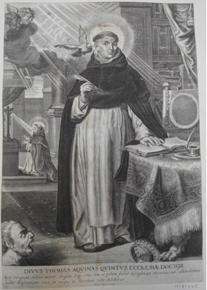 DIVVS THOMAS AQVINAS QVINTVS ECCLESIÆ DOCTOR. / Ipse tanquam imbres mittet eloquia Sapientiæ, et palam faciet disciplinam Doctrinæ suæ, collaudabunt / multi Sapientiam eius, et vsque in Sæculum non debilitur. Herman Weyen excudit
