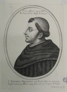 S. THOMAS AQVINAS ord. Præd. obijt in monast. / Fossæ-nouæ. 7. Mart. suæ æt. 50. corpus Tolosæ. / B. Moncornet excud.