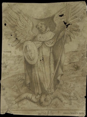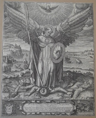 Son instrument à écrire lui sert à pourfendre les adversaires de la foi catholique qu’il foule aux pieds. De l’un on ne voit que la tête enturbannée (est-ce un vaincu de Lépante ?) ; l’autre est un vieillard étendu sur le dos. Chacun des deux vaincus est muni de son livre, l’enturbanné dont la droite s’appuie sur le livre ouvert, le barbu appuyé sur le livre fermé. Bien que les mains ne soient qu’un détail de la scène, le graveur les a traitées de manière soignée et élégante. Le combat représenté constitue bien un affrontement doctrinal, dont le théologien se dresse victorieux.