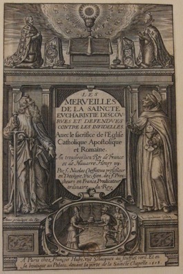 Titre illustré pour Nicolas COEFFETEAU (1574-1623), Les merveilles de la saincte evcharistie discovrves et defendves contre les infidelles. Auec le sacrifice de l’Eglise Catholique Apostolique et Romaine. Au treschretien Roy de France et de Nauarre Henry iiij. Par f. Nicolas Coeffeteau professeur en Theologie, Vic. Gen. des f. Prescheurs en France, Predicateur ordinaire du Roy, A Paris chez François Huby, ruë St Iacques au soufflet verd. Et en sa boutique au Palais, deuant la porte de la Saincte Chapelle, 1608.