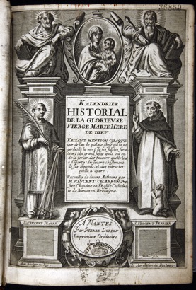 Kalendrier / historial / de la glorievse / Vierge Marie Mere / de Diev. / Faisant mention chaqve / iour de l’an de quelque chose qui la re: / garde ; de la mort de ses fideles serui: / teurs ; du grand soing quils ont eu / de la seruir, des faueurs quelle leur / a departy ; du seuere chastiment / de ses ennemis ; et des miracles / qu’elle a operé. / Recueilly de diuers Autheurs / par M. Vincent Charron Pre: / stre Chanoine en l’Eglise Cathedra: / le de Nantes en Bretaigne