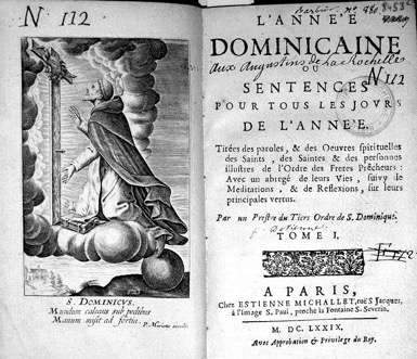 Frontispice pour [Bernard de VIENNE (?)], L’Année dominicaine ou Sentences Pour tous les jovrs de l’année. Tirées des paroles, & des Oevvres spirituelles des Saints, des Saintes & des personnes illustres de l’Ordre des Freres Prêcheurs :Avec un abregé de leurs Vies, suivy de Meditations, & de Reflexions, sur leurs principales vertus. Par un Prestre du Tiers Ordre de S. Dominique, Tome I, A Paris, Chez Estienne Michallet, ruë S Jacques, à l’image S. Paul, proche S. Severin, 1679.