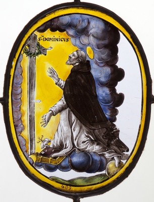 L’iconographie de saint Dominique vénérant la croix du Christ est présente sur un médaillon de vitrail du XVIIe siècle conservé aux Musées royaux d’Art et d’Histoire de Bruxelles. Ce médaillon, le présent frontispice et la taille-douce de Jean Messager s’inspirent peut-être d’une production anversoise non repérée dans le cadre de cette étude. Pour des raisons pratiques, le médaillon est présenté ci-après, avant même les planches des volumes de l’Année dominicaine.